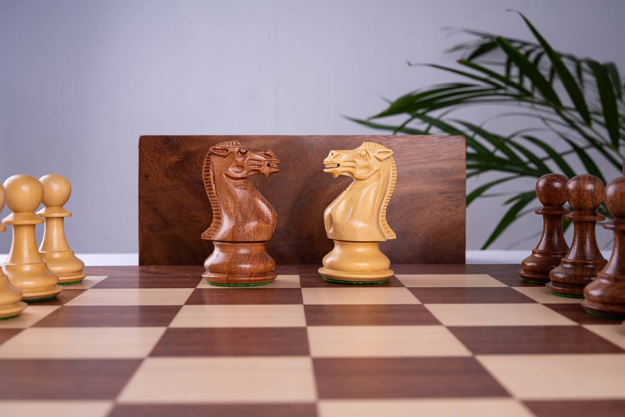 Les pièces sont quant à elles sculptées dans du buis naturel et du buis brûlé. Leur vernis brillant leur confère un éclat raffiné, tout en mettant en valeur la finesse du dessin de chaque figure. Le roi culmine à 100 mm, accompagné d’un jeu complet de 34 pièces, toutes lestées et feutrées pour une tenue parfaite sur l’échiquier. Le cheval, particulièrement expressif, donne vie à l’ensemble par la qualité de sa sculpture.